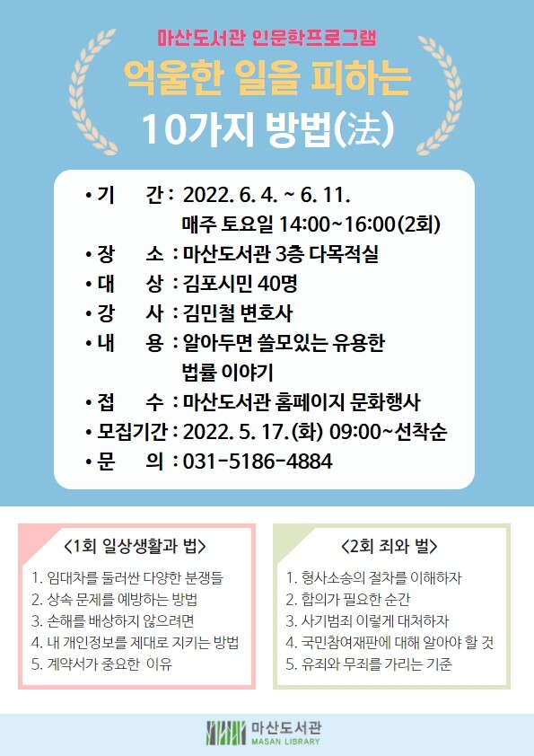 1주차는 ‘일상생활과 법’, 2주차는 ‘죄와 벌’로 구성되며 세부 내용은 마산도서관 홈페이지 문화행사 신청에서 확인할 수 있다.