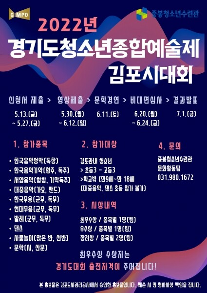 이번 경기도청소년종합예술제 김포시대회는 전년도와 같이 ‘영상심사’로 진행되며 대회일정은 5월 13일 참가접수를 시작으로 5월 30일 영상제출과 6월비대면 심사, 7월 시상으로 진행될 예정이다.