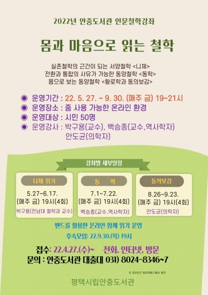 안중도서관, 2022년 인문철학강좌 ‘몸과 마음으로 읽는 철학’ 운영