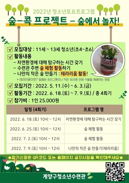 프로그램은 자연환경에 대해 탐구하는 생태교육 수련관 주변 숲 체험활동 밀폐된 유리그릇이나 작은 유리병 안에 식물을 재배해 보는 테라리움 활동인 ‘나만의 작은 숲 만들기’ 등으로 구성됐다.