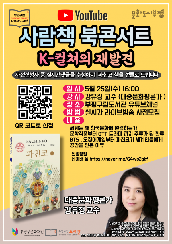사람책 북 콘서트는 오는 25일 대중문화평론가 강유정 교수가 부평구립도서관 유튜브 채널을 통해서 실시간으로 진행한다.