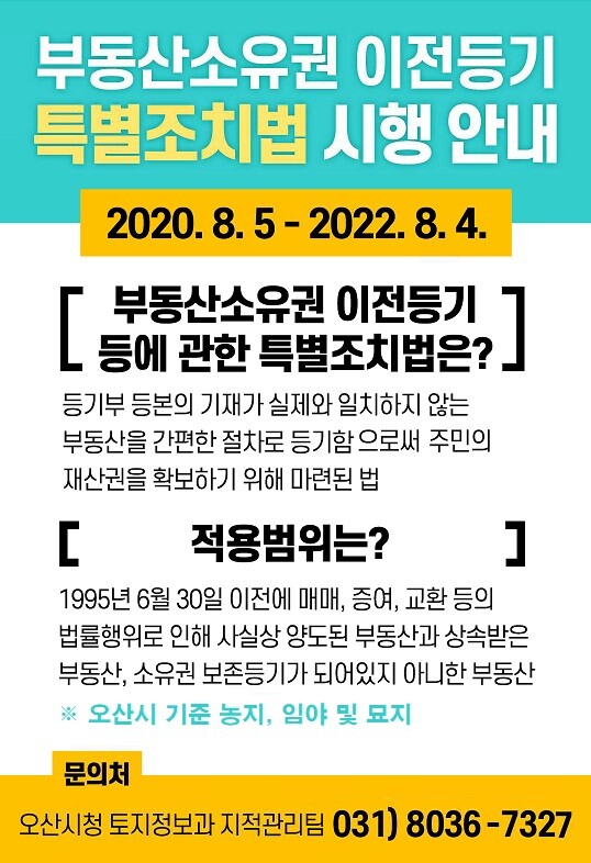 적용범위는 1995년 6월 30일 이전에 매매·증여·교환 등의 법률행위로 사실상 양도된 부동산, 상속받은 부동산, 소유권보존등기가 되어 있지 않은 부동산이며 오산시는 인구 50만 미만의 시 지역으로 농지, 임야 및 묘지가 적용대상이다.