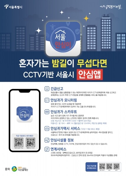 서울시는 안심이앱이 안심 귀가지원 뿐 아니라 학교폭력, 스토킹, 조난 등 유사 시 긴급구조까지 가능할 수 있도록 해, 시민 대표 호신앱으로 자리매김할 수 있도록 하겠다고 11일 밝혔다.