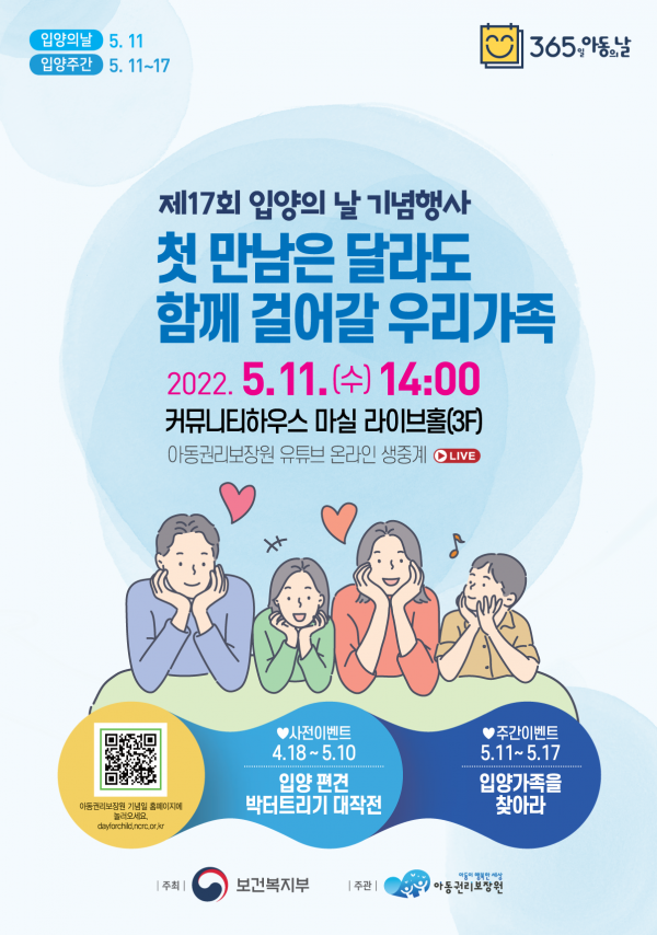 아울러 5월 11일부터 5월 17일까지 7일간을 입양주간으로 해 아동권리보장원 기념일 누리집을 통해 입양인식 개선을 위한 참여 이벤트를 진행한다.