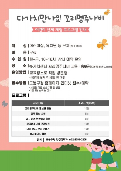 이동진 도봉구청장은 “이번 꼬리명주나비 프로그램을 통해 미래세대인 어린이들이 우리 지역의 깃대종에 대해 이해하고 생태보전 의식을 키울 수 있길 기대한다.
