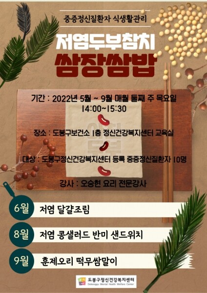 프로그램은 도봉구보건소 1층 정신건강복지센터 교육실에서 진행되며 5월 저염 두부참치 쌈밥 만들기 6월 저염 달걀조림 만들기 8월 저염 콩샐러드 반미 샌드위치 9월 훈제오리 떡무쌈말이 등 실생활에도 쉽게 따라 할 수 있는 난이도로 구성됐다.