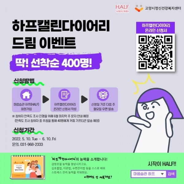 2차 이벤트는 5월 10일부터 6월 10일까지 한 달간 진행되며 마음습관 프로그램 하프에 가입 후 온라인 신청서를 작성한 선착순 400명에게 하프캘린다이어리를 무료로 배포한다.