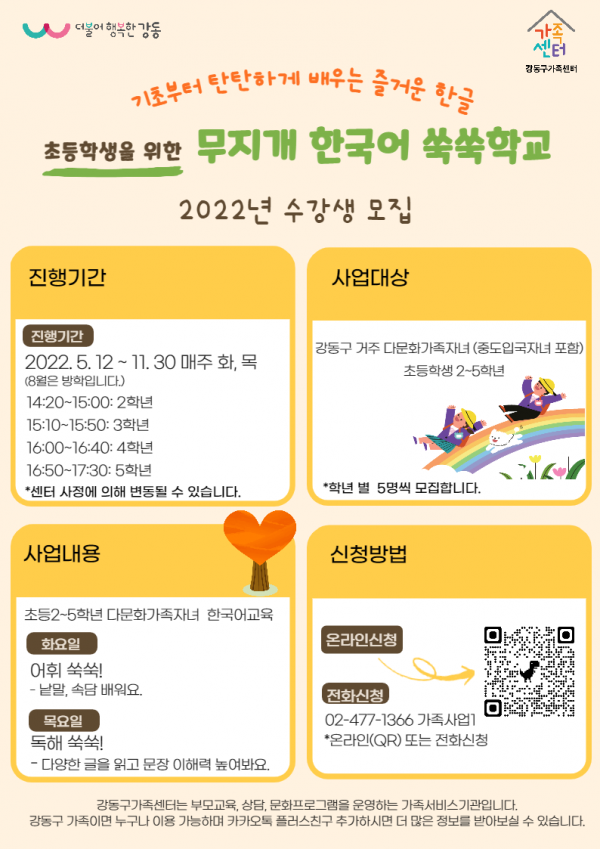 ‘무지개 한국어 쑥쑥학교’는 매주 화요일과 목요일 강동구에 거주하는 다문화가족 및 중도입국자 자녀를 대상으로 초등학생 2학년부터 5학년까지 수준별 한글학습을 무료로 진행하며 정서지능 향상 프로그램 등 다양한 과정으로 구성했다.