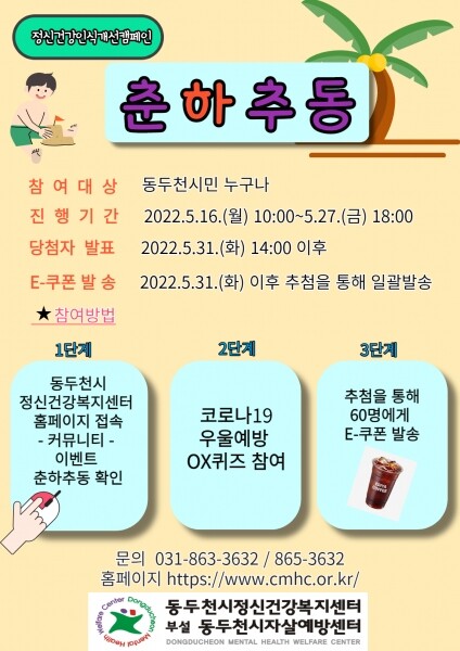 이번 캠페인은 오는 5월 16일부터 27까지 동두천시정신건강복지센터 홈페이지에 접속해 시민 누구나 참여할 수 있다, 또한, 퀴즈에 참여한 정답자 중 60명을 추첨해 소정의 상품을 제공하는 이벤트를 진행할 예정이다.