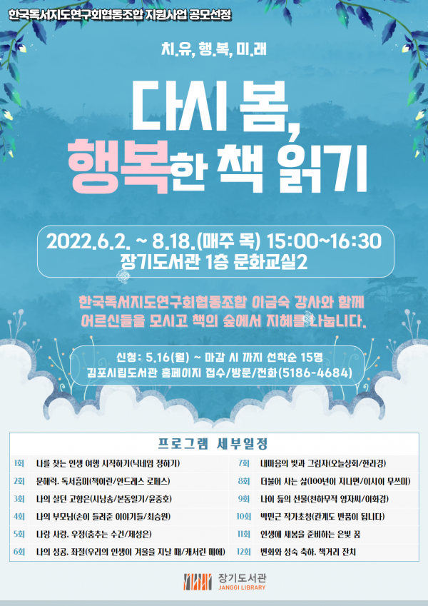 이번 강좌는 경기도가 주최하고 한국독서지도연구회협동조합에서 주관하는 2022년도 ‘정보취약계층 독서문화프로그램’ 지원사업 공모선정에 따라 운영하는 어르신 대상 독서문화프로그램이다.