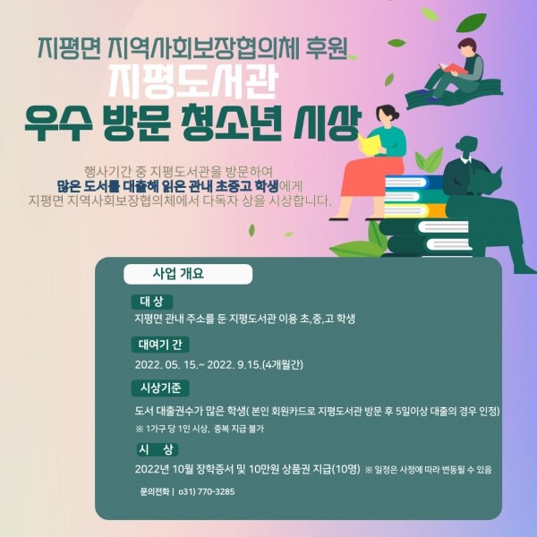 해당 사업은 지평면에 주소지를 둔 지평도서관 이용 초·중·고학생을 대상으로 22년 5월 15일부터 9월 15일까지 4개월간 도서대출 권수가 많은 학생 10명을 선별해 장학증서 및 장학금으로 도서상품권 10만원을 전달하게 된다.