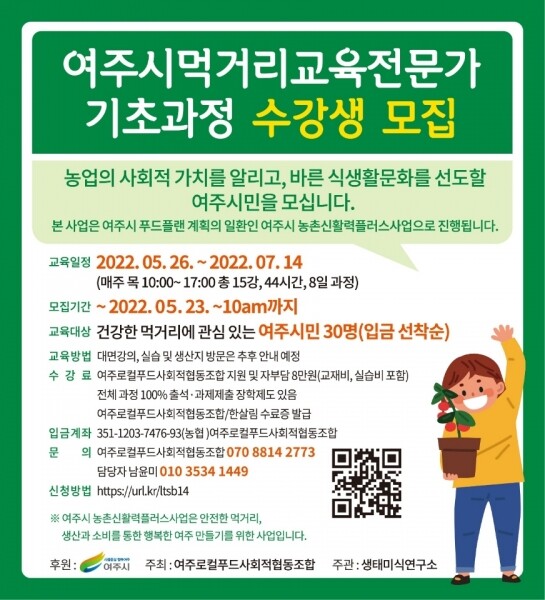 교육신청은 5월 23일 오전 10시까지 인터넷으로 건강한 먹거리에 관심 있는여주시민이면 누구나 신청할 수 있으며 수강료는 교재비 및 실습비로 8만원이 발생한다.