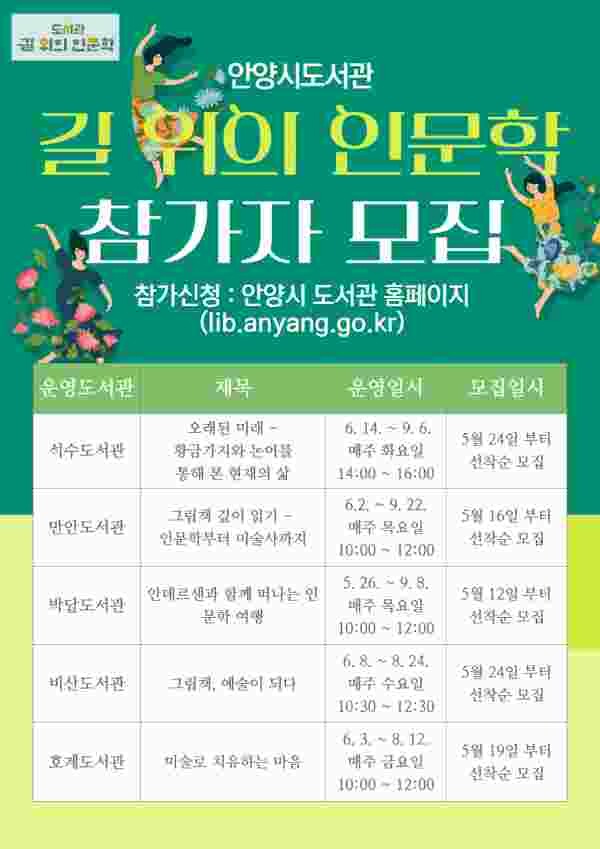 5월 12일 박달도서관에서 가장 먼저 수강생 모집을 시작하며 이어 만안도서관 5월 16일 호계도서관 5월 19일 석수도서관과 비산도서관이 5월 24일 부터 수강생을 모집한다.