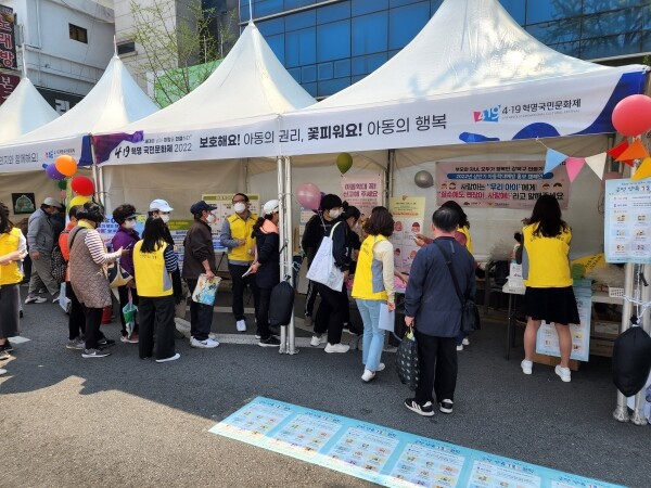 구는 4월 18일 4·19혁명국민문화제 전야제 행사장 내에 아동학대 예방 홍보 부스를 설치하고 아동학대예방 OX퀴즈, 아동학대 현황자료 전시 등 다양한 프로그램을 진행했다.