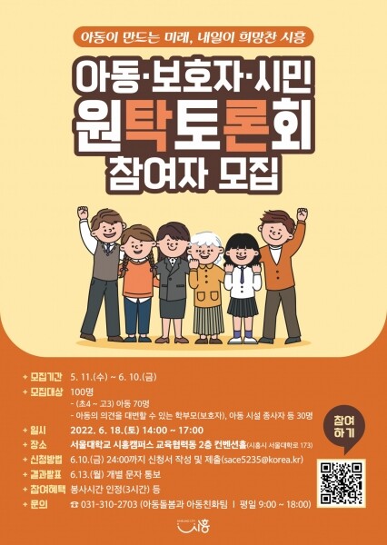 모집 대상은 시흥시에 거주하고 있는 초등학교 4학년에서 고등학교 3학년까지의 아동 70명과 학부모 20명, 아동 시설에 종사하는 아동 관계자 10명이다.