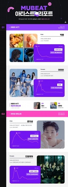뮤빗 팬덤실험실의 아티스트 리포트는 한 달간 집계된 뮤빗 내 데이터를 바탕으로 매월 발간하는 아티스트 보고서로 가장 우수한 성과를 거둔 아티스트를 선정하는 ‘이달의 HIT’ 부문과 주목할 만한 성과를 보여준 ‘라이징 아티스트’ 부문으로 구성된다.