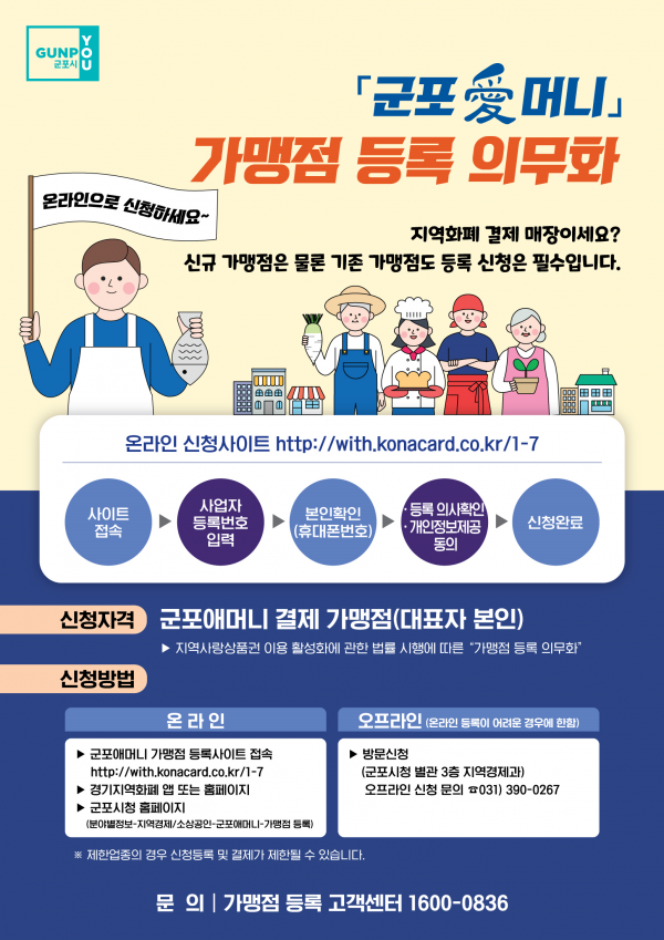 군포시 관계자는 “시민 모두가 군포愛머니를 이용하기 위해서는 지역화폐 가맹점 등록이 필수”며 “미등록 가맹점의 경우 등록기간 안에 반드시 가맹점 등록을 해달라”고 당부했다.