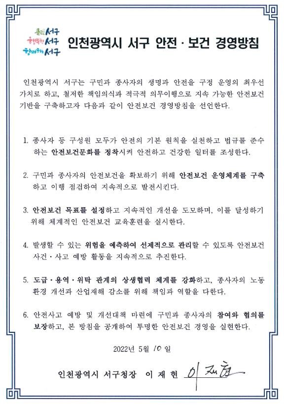‘인천광역시 서구 안전보건 경영방침’은 안전보건문화 정착, 안전보건 운영체계 구축, 안전보건 목표 설정, 위험 예측 및 선제적 관리, 상생협력체계 강화, 구민과 종사자의 참여와 협의 보장 등을 핵심 과제로 담고 있다.