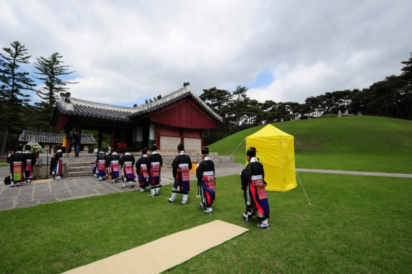 ? 세종대왕릉 정자각에서 거행되는 숭모제향은 초헌관의 분향과 헌작, 축관의 축문 낭독, 문화재청장의 대통령 명의 화환 헌화와 분향, 축사의 순서로 진행된다.