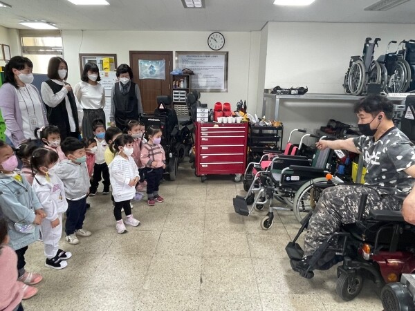 지난 4월에는 시립신촌어린이집 어린이들이 수리센터를 견학하며 휠체어 작동법, 관리법 및 장애를 이해하는 시간을 가졌다.