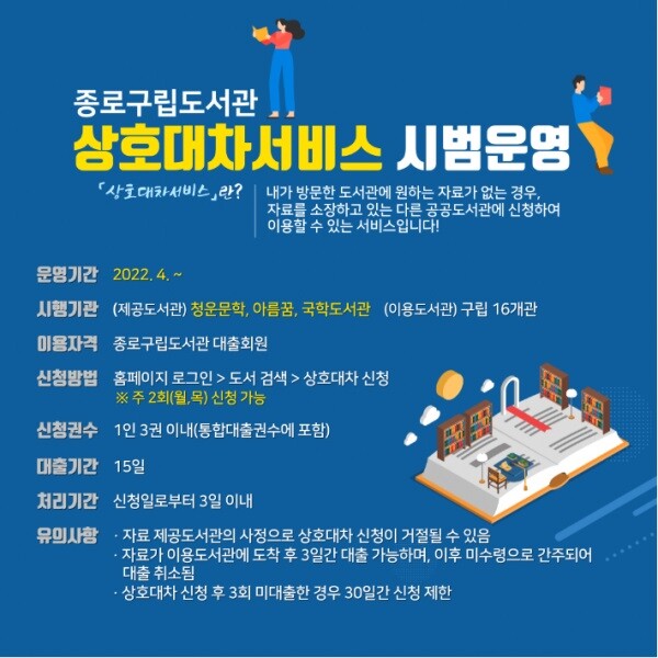 청운문학도서관 아름꿈도서관 어린이청소년국학도서관 등 공공도서관 세 곳의 소장 자료를 공유해 구민들의 도서 선택 폭을 넓히고 필요한 책을 찾아 이동해야 하는 불편함도 줄일 수 있어 편리하다.
