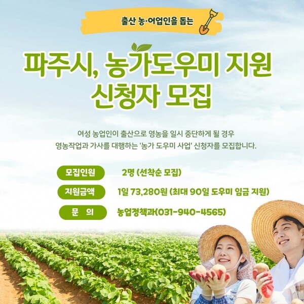 파주시는 ‘2022 농가도우미 지원사업’을 통해 출산 여성 농·어업인을 지원 여성농·어업인들의 삶의 질 향상을 위한 생산적 복지정책으로 정착될 수 있도록 추진할 방침이다.