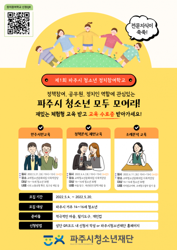 교육신청은 파주시청소년재단 홈페이지를 통해 신청 가능하며 문의사항은 파주시청소년재단 정책기획과(031-540-5206)로 하면 된다.