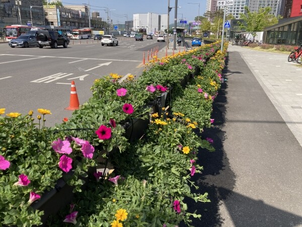 난간 걸이화분 형태로 조성되는 꽃 화분은 화사한 보라 핑크를 혼합한 웨이브페튜니아를 배경식재로 해 비덴스와 제라늄으로 식재를 더해 가로경관을 더욱 아름답고 화려하게 빛낼 예정이다.