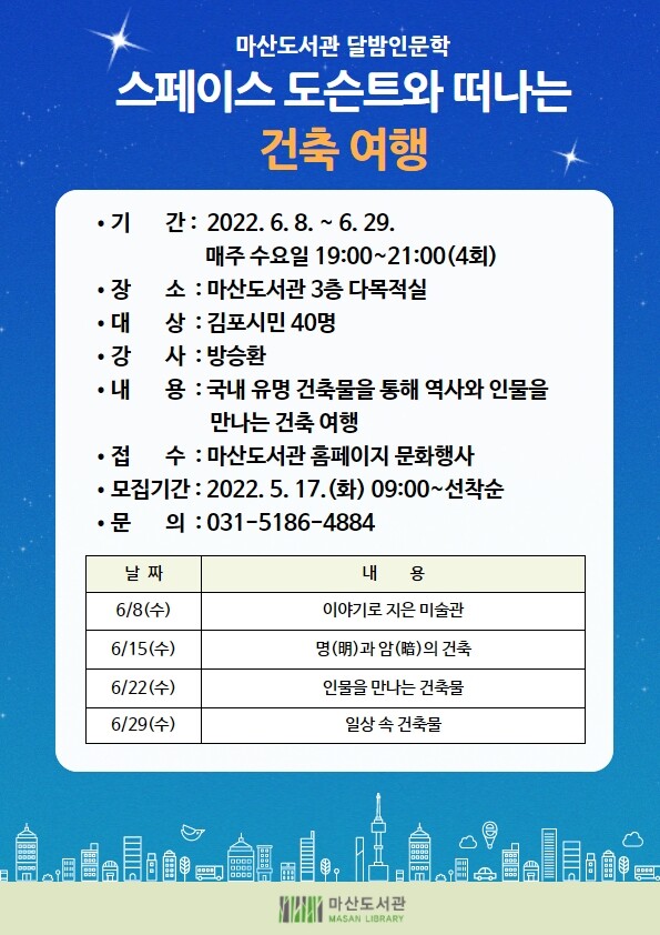 강의는 총 4회로 진행되며 1주차는 ‘이야기로 지은 미술관’, 2주차는 ‘명과 암의 건축’, 3주차는 ‘인물을 만나는 건축물’, 4주차는 ‘일상 속 건축물’로 구성되며 세부 내용은 마산도서관 홈페이지 문화행사 신청에서 확인할 수 있다.