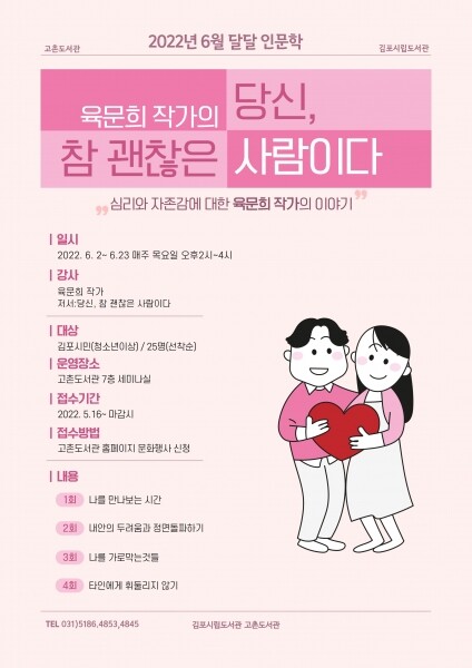 프로그램 신청은 5월 16일 월요일 오전 9시부터 고촌도서관 홈페이지에서 온라인으로 이루어지며 선착순 25명을 모집한다.