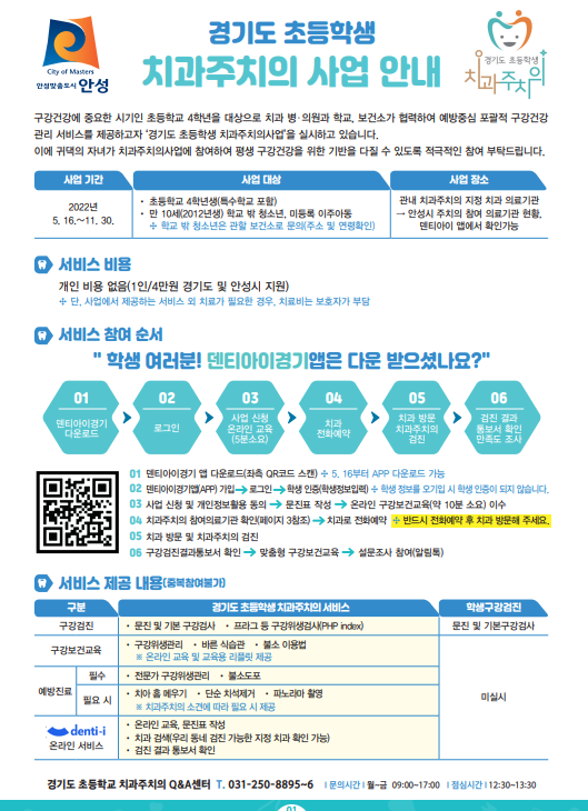 현재 안성시 소재 주치의 참여 치과 의료기관은 22개이며 주치의 서비스로는 구강검진 구강보건교육 예방진료 등을 실시하며 주치의 소견에 따라 필요 시 치아 홈 메우기, 단순 치석제거, 파노라마 촬영이 제공된다.