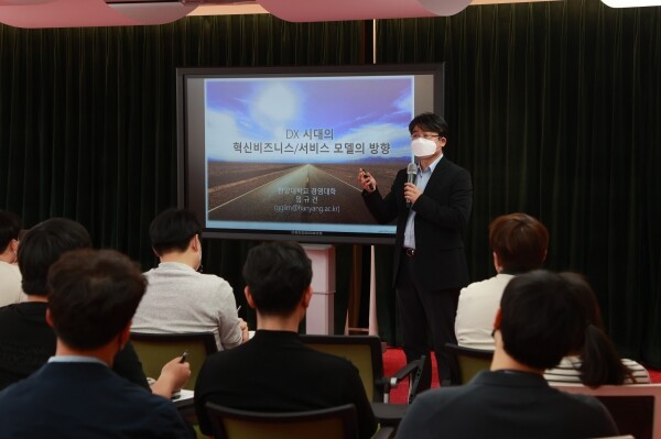 지난 4일 1차 교육에서 한양대학교 임규건 경영학부 교수가 ‘디지털 불확실성 공공기관에서의 전략 방향’에 대해 강연했다.