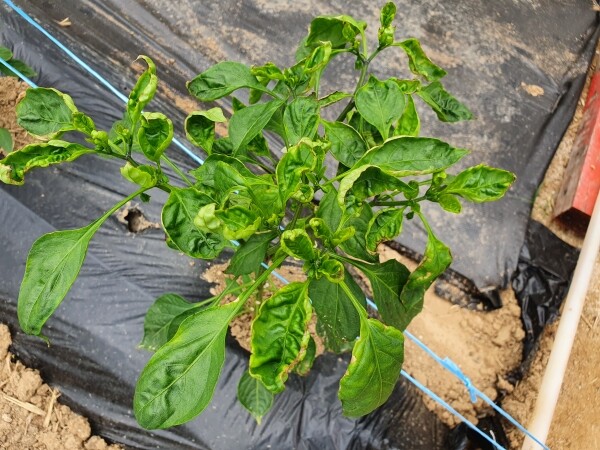 최근 고추와 토마토에서 자주 발생하는 토마토반점위조바이러스는 발병초기 선단부위가 연녹색으로 변하다 검은 반점이 나타났다.