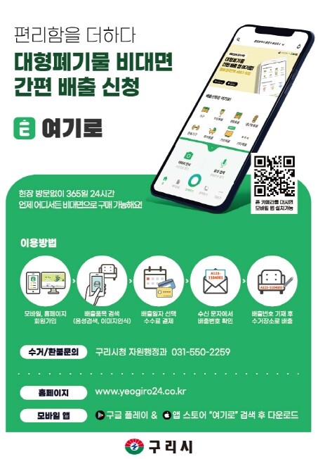 구리시는 대형생활폐기물 배출시스템을 인터넷 배출신청 동 행정복지센터 방문 신청 모바일 애플리케이션 접수 무인 스마트 키오스크 접수로 전면 개선했다.