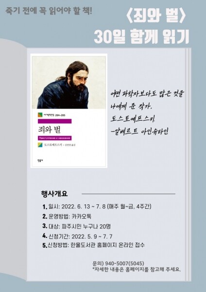 프로그램은 운영기간 30일 동안 월요일에서 금요일까지 온라인으로 진행되며 파주시민 누구나 선착순 20명 한울도서관 홈페이지를 통해 신청하면 된다.
