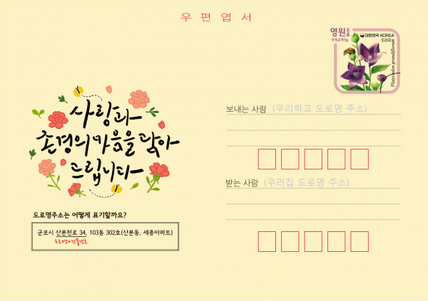 이는 군포시가 관내 초등학교 3, 4학년을 대상으로 실시한 ‘도로명주소를 이용한 사랑의 엽서 쓰기’ 행사에 따른 것이다.