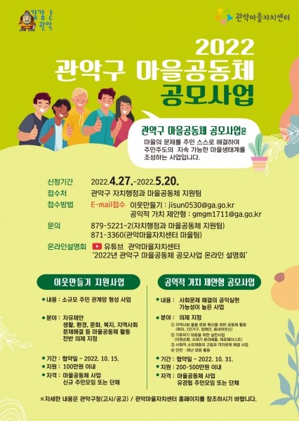 한편 구는 원활한 사업 추진을 위해 관악마을자치센터에서 사전 상담, 회계교육 등 컨설팅을 지원하고 있으며 관악마을자치센터 유튜브 채널에 사업설명회 영상을 게시해 사업 안내, 사업제안서 작성 방법, 사업비 집행기준 등을 안내하고 있다.