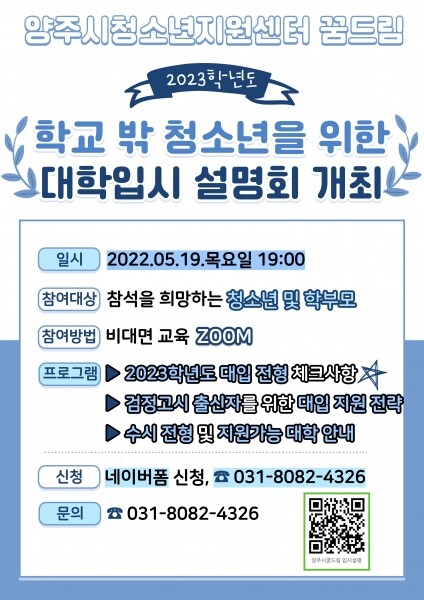 대학입시설명 참석을 희망하는 학교 밖 청소년과 학부모는 네이버폼이나 양주 꿈드림을 통해 신청하면 된다.