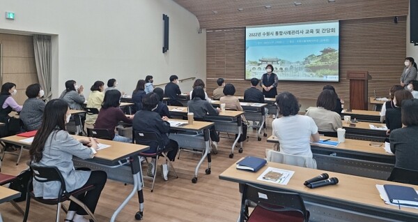 수원시는 17일 권선구 수원시홍재복지타운 교육장에서 ‘2022년 통합사례관리사 교육 및 간담회’를 열고 효율적인 통합사례관리 서비스 운영 방안 등을 논의했다.