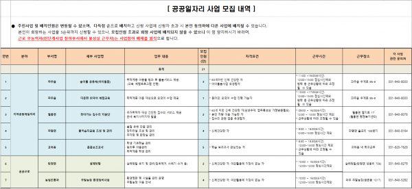 지역공동체일자리사업은 다문화가정 지원사업, 관광자원 활용사업 등 5개 분야 총 15명을 모집하며 공공근로는 주말농장 등 2개 분야 총 6명을 모집한다.