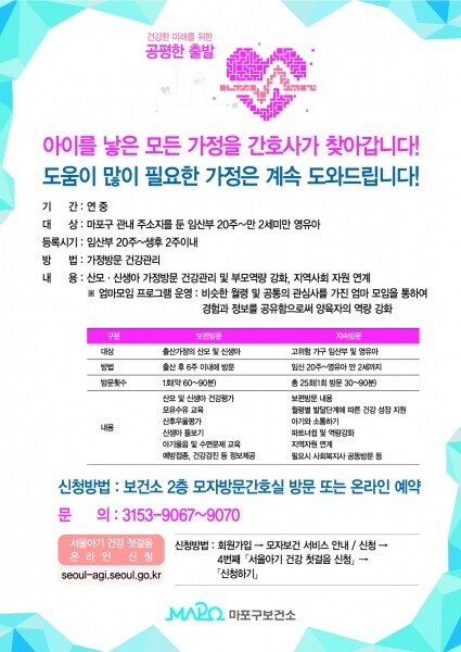 신청 방법은 서울아기 임신출산 정보센터 ‘모자보건 서비스 안내 ? 서울아기 건강 첫걸음 사업’에서 온라인 신청하거나 마포구 보건소 2층 모자방문간호실을 방문해 신청할 수 있다.