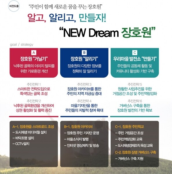 이천시는 장호원버스터미널 일원 84,000㎡의 도시재생활성화지역을 대상으로 미디어월 설치 및 운영, 도시재생기자단 운영 및 소식지 발행, 주민거점시설 마을발전소 조성, 장호원 거닐기 사업, 장호원 알리기 사업, 장호원 우리 마을 발전소 만들기 사업 등을 담은 “주민이 함께 새로운 꿈을 꾸는 장호원”, “알고 알리고 만들자 NEW Dream 장호원” 이란 비전과 목표로 장호원 주민들의 아이디어를 계획안으로 만들어 공모에 최종 선정됐다.
