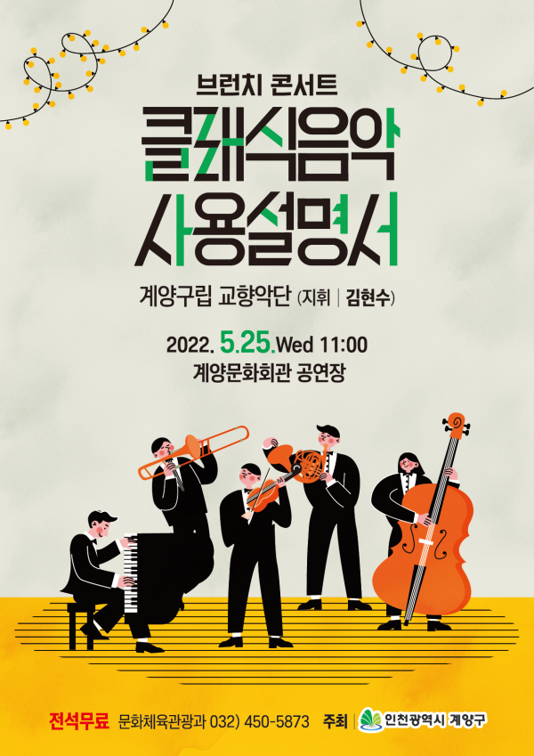 박형우 계양구청장은 “이번 브런치 콘서트가 코로나19로 중단됐던 문화공연을 향유하고 구민분들의 지친 마음을 치유하는 회복의 시간이 됐으면 하는 마음으로 준비했다”며 “아름다운 클래식 선율처럼 계양구민의 앞날도 행복하고 즐거운 삶이 지속되기를 기원하며 많은 분들이 공연장에 찾아와주시길 바란다”고 밝혔다.
