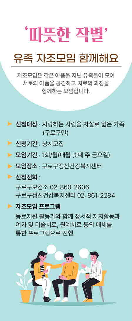 자살로 가족을 잃은 유족들이 모여 서로의 아픔을 공감하고 치유하는 시간을 갖고 회복의 과정을 함께 하며 심리적·정서적 안정을 되찾을 수 있도록 돕는 프로그램이다.