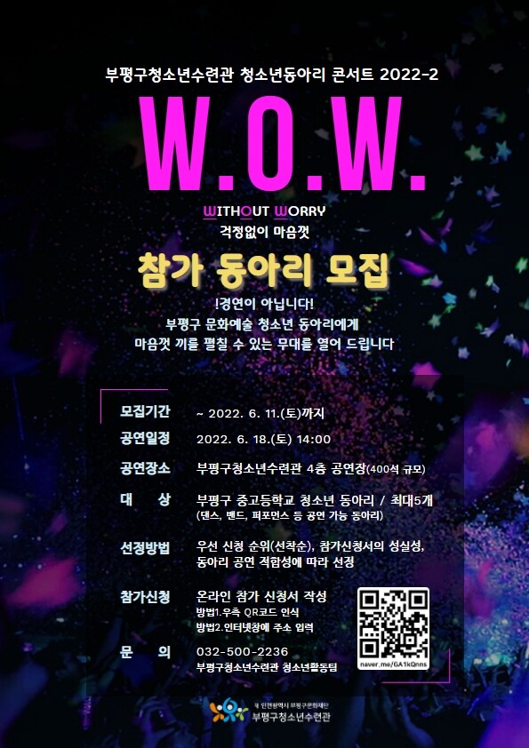 이번 콘서트 ‘W.o.W.’에는 구 청소년수련관에 소속된 청소년동아리뿐 아니라 부평구 내 중·고등학교 청소년동아리도 참가할 수 있다.