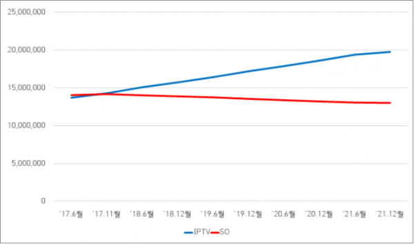 특히 ’17.11월 IPTV 가입자 수가 SO 가입자 수를 앞선 이후 IPTV는 지속적으로 증가하는 반면 SO는 감소하고 있는 추세로 IPTV와 SO간 가입자 수 격차는 ’21년 12월 말 기준 약 676만명으로 확대된 것으로 나타났다.