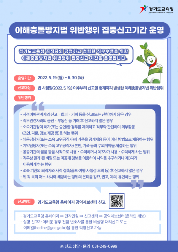 도교육청은 이해충돌방지법이 시행되는 5월 19일부터 6월까지 이해충돌방지법 위반 행위 집중 신고 기간을 운영한다.