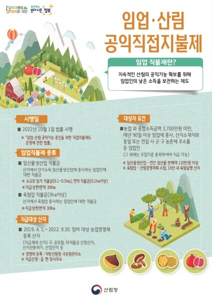 올해 직불금 지급 대상은 오는 5월 31일까지 임업경영체에 등록된 산지로 한정되며 2023년 이후 직불금 신청자는 오는 9월 30일까지 임업경영체 등록을 완료해야 한다.