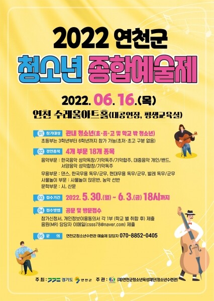경기도와 연천군이 주최하고 연천군청소년육성재단이 주관하는 청소년종합예술제는 청소년들의 열띤 경연을 현장에서 느낄 수 있도록 6월 16일 오전 10시부터 연천수레울아트홀에서 대면 경연으로 진행된다.