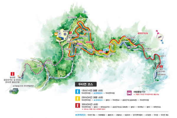두타연이라는 이름은 1천년 전 두타사라는 절이 있었다는 데에서 비롯됐으며 2013년부터 제한적으로 개방하고 있다.